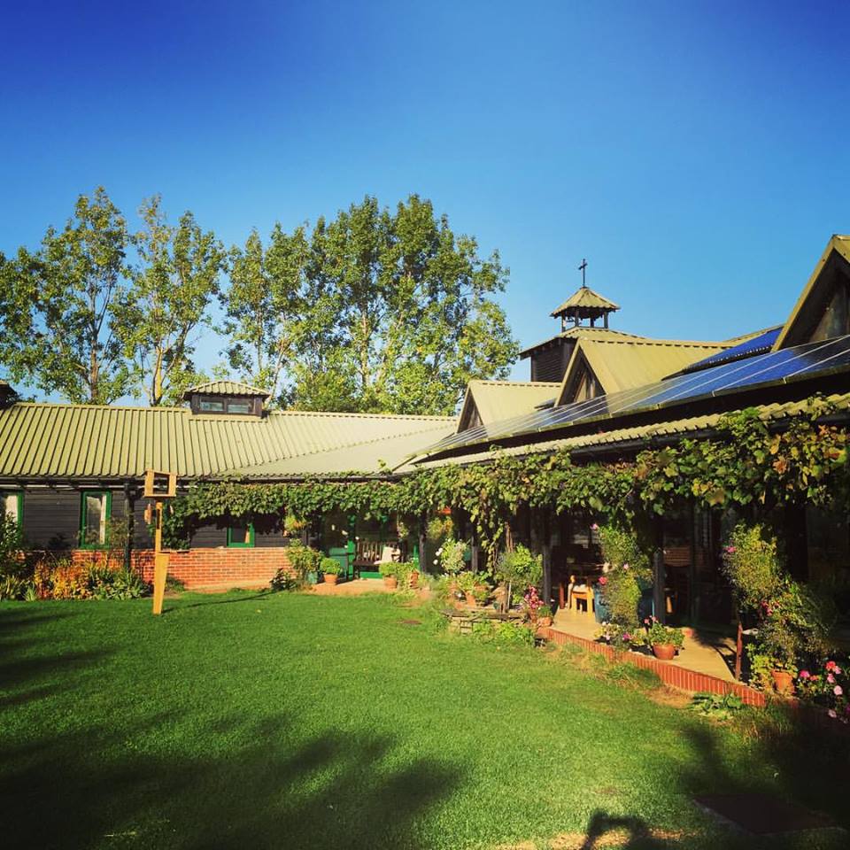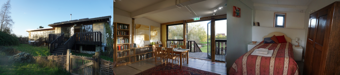 This is our newest building and contains more bedrooms as well as a quiet library room and an acessible toilet. It is constructed of rammed earth, straw bales with a lime render. It has small radiators in all the bedrooms.