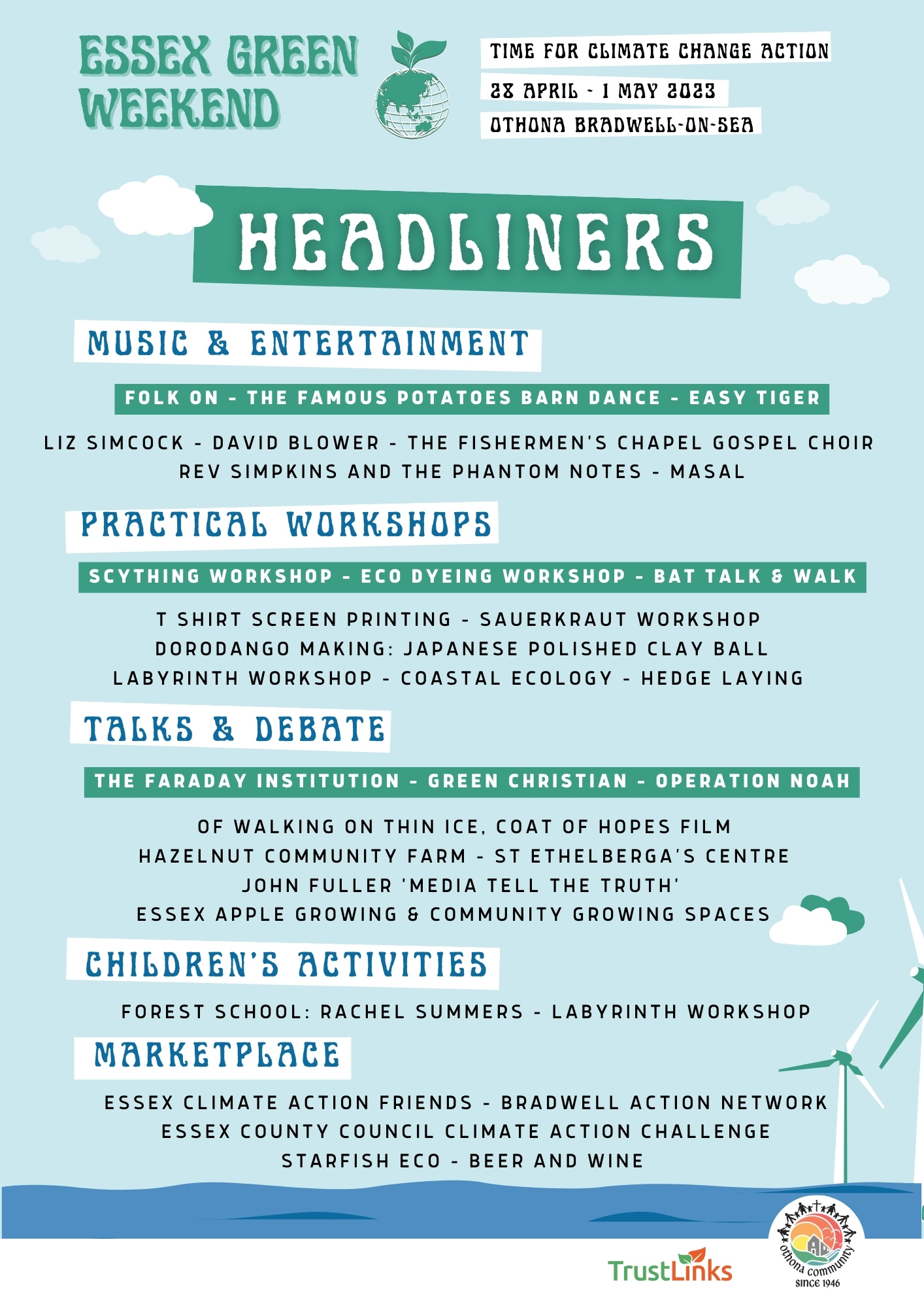 Take a look at the fantastic line up for our Essex Green Weekend. This weekend is being run in partnership with Trust Links Charity and supported by grants from the Essex County Council Climate Action Challenge Fund and the Essex Community Foundation. There are still spaces available for campers, a few rooms and day visitors are very welcome. You can book via our website -Essex Green Weekend | Othona Essex.