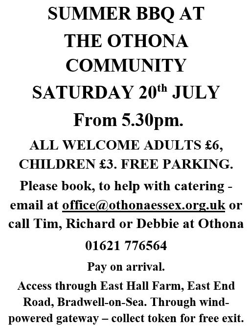 We are having a community BBQ on Saturday 20th July from 5.30pm onwards. If you would like to come please email the office (office@othonaessex.org.uk) or call us on 01621 776564. All are welcome, the cost for adults is £6 and children £3.