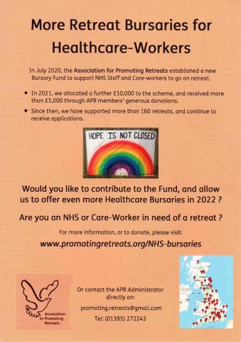The bursary scheme for NHS and Healthcare workers has been extended until the end of June 2022. If you would like to apply for a bursary for one of our events please email us (bradwell@othona.org)